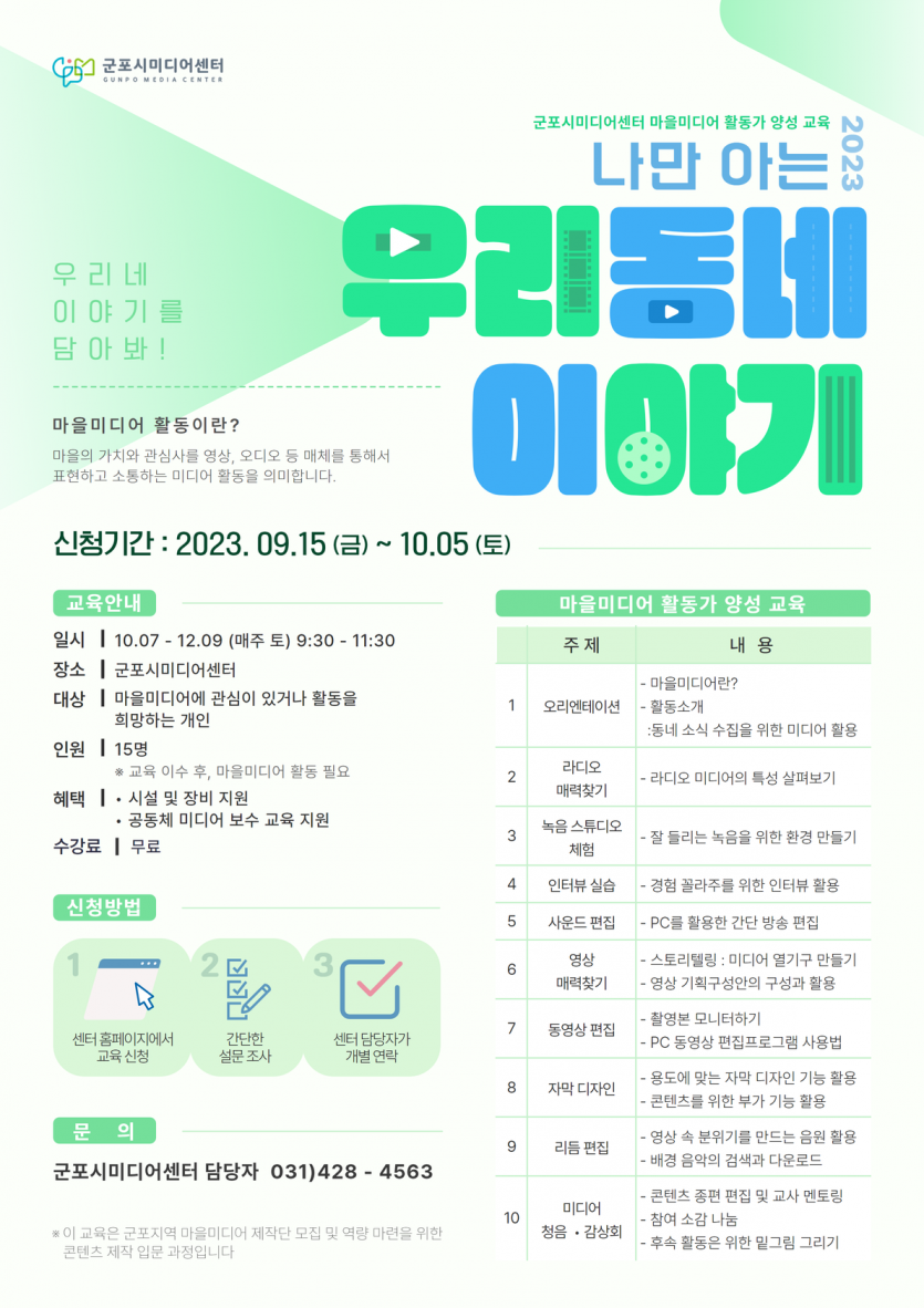 ※ 이 교육은 마을미디어 활동가 양성 교육으로 이수 후, 마을미디어 활동이 필요합니다.