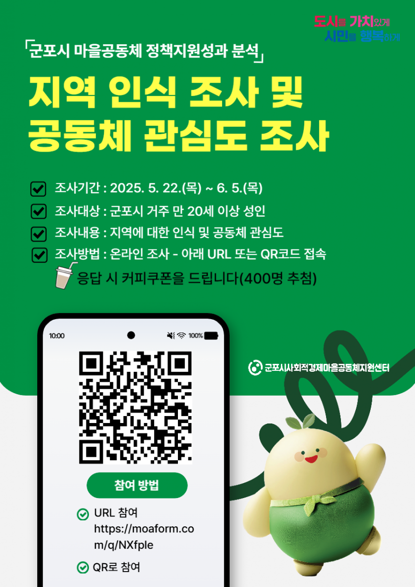 [군포시 마을공동체 정책지원성과 분석] 지역 인식 조사 및 공동체 관심도 조사 설문 참여(커피쿠폰 증정) |