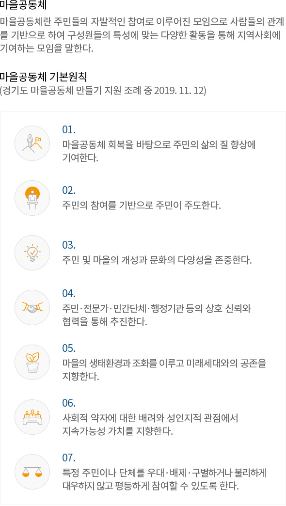 마을공동체 회복을 바탕으로 주민의 삶의 질 향상에 기여한다.